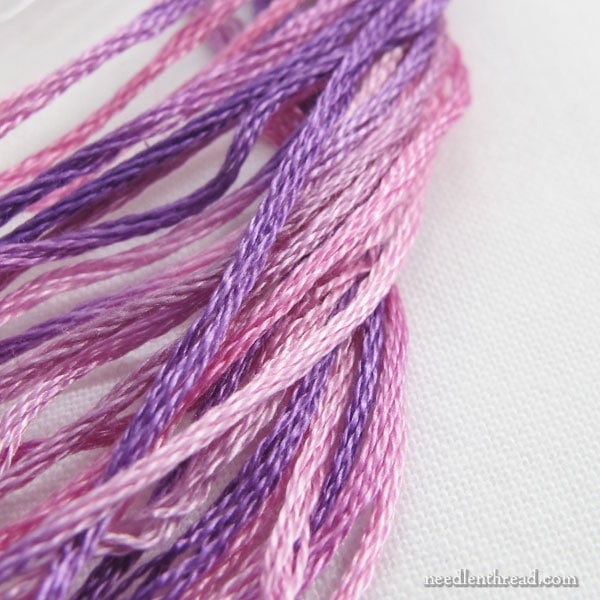 I find it useful, before stitching with a variegated thread, to un-skein it and get a good look at the sequence of the color changes. That way, I know what I’m going to be working with and I know what’s coming up as I stitch.