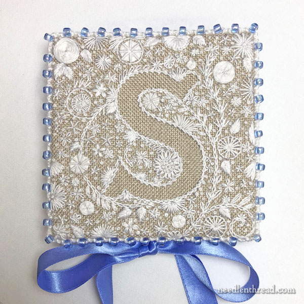 What a lovely, pretty finish to the monogram needlebook I love it with the blue ribbon and beads although blue is not my favourite colour it looks lovely on the needlebook contrasting with the natural linen and white thread and the lovely various embroidery stitches. I wish I could create something like this you very talented and I can’t believe it’s only 3.5 inches beautiful. I’m looking forward to the new voided monograms and alphabet ideas that will be lovely. Thank you for sharing with us the finished project on the S voided monogram and for the photos and links on the project. Very beautiful.