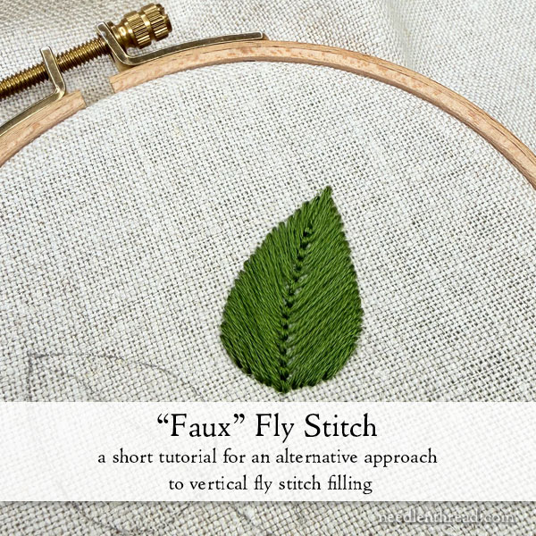 After working the straight stitch, I’m going to backstitch down the center line of the leaf, working small backstitches that are about 3/16″ long (not quite 1/8″). In a normal vertical fly stitch, these small backstitches would be the holding stitches on each fly stitch.