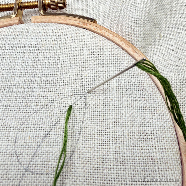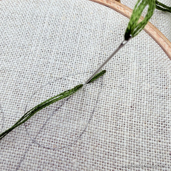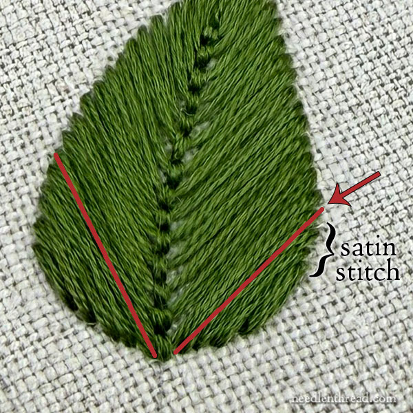 Whenever you want to form a nice sharp tip on a shape like this, extend your first (center) stitch out beyond the design line, just beyond the tip of the leaf by a little bit.