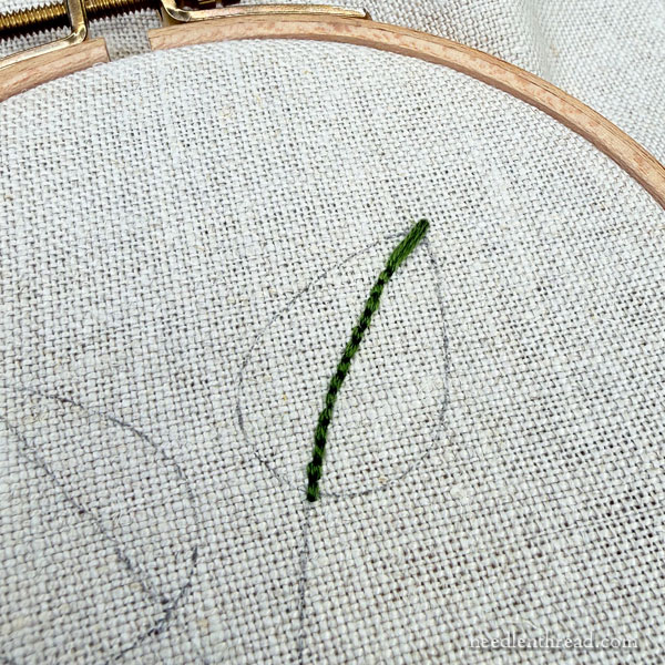 Backstitch down the whole vein of the leaf, keeping the stitches as uniform in length as possible.