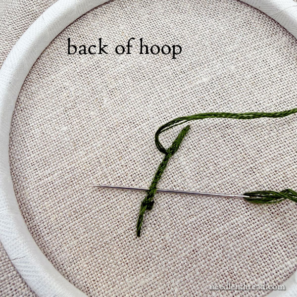 When you get to the end of the backstitch, assuming you have more usable thread on your needle, turn the hoop over and return to the tip of the leaf by whipping through the backs of a couple stitches. This prevents a long loose thread on the back of the fabric.