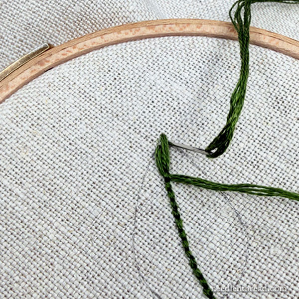 Emerge on the other side of the leaf, on the design line, slightly below the beginning of the first “fly” stitch, and continue this process down the shape of the leaf.