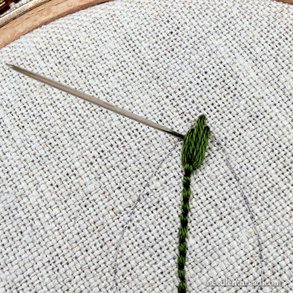 (You can see a tutorial for tiny leaves worked with vertical fly stitch here. In that tutorial, I start with a twisted chain stitch, to give the tip of the leaf a little curve. The thread, which is perle cotton in that tutorial, is quite heavy and twisted, so the whole look is different, cut you can at least see the concept!)