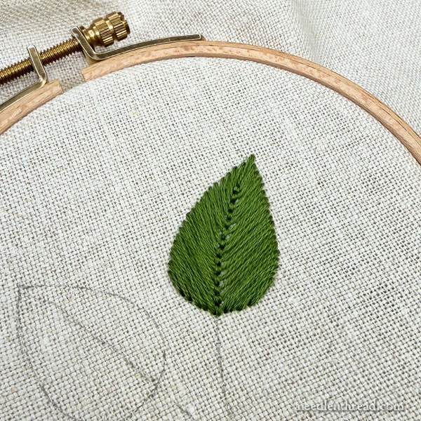 It’s wonderfully suitable for filling in leaf shapes, because the small holding stitches end up creating a vein down the center of the leaf with very little effort.