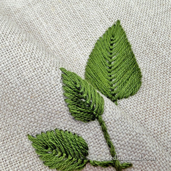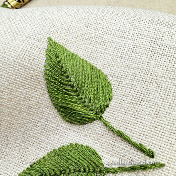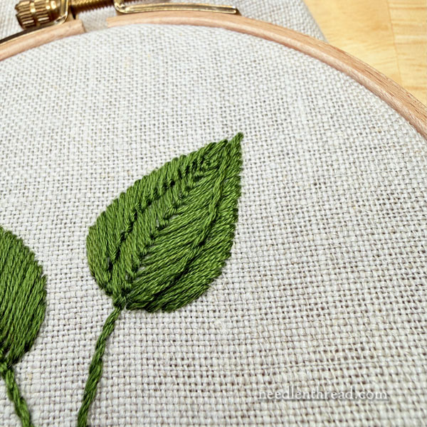 On the somewhat messy example above (funny what shows up in close-up photos that you totally miss in real life!), on the left side of the stitch, I worked a backstitch down the leaf, following the general shape of the outline and set inside that half of the leaf. It holds the long stitches down.