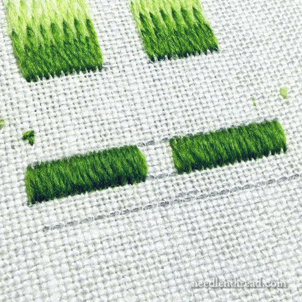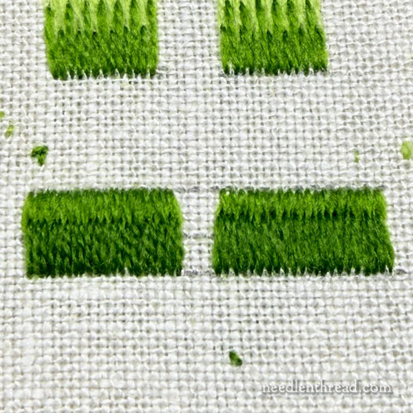 The difference is not remarkably great, necessarily, but remember two things: this is a small sample – over a larger area, with more rows, the difference would be more obvious; and I’m working with wool. Wool is a more “forgiving” thread in a lot of ways, because it has poof and a little more bulk than most embroidery threads. It spreads better.