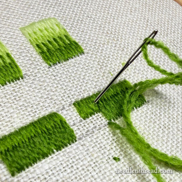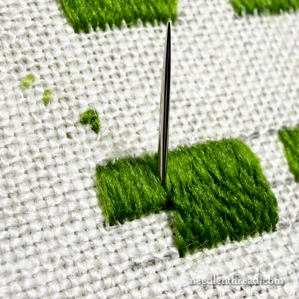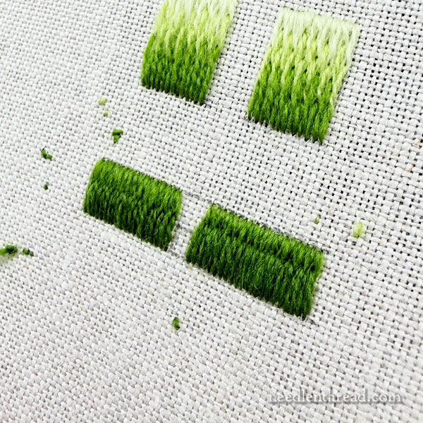 My point in explaining all this is to further illustrate the up-and-down question from Monday’s article about long and short stitch. Today, I just want to offer a further illustration on the difference you can achieve by choosing to split stitches going up or going down.